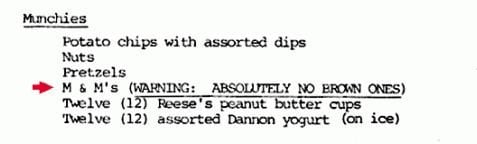 The contract rider read like a version of the Chinese Yellow Pages because there was so much equipment, and so many human beings to make it function. So just as a little test, in the technical aspect of the rider, it would say “Article 148: There will be fifteen amperage voltage sockets at twenty-foot spaces, evenly, providing nineteen amperes…” This kind of thing. And article number 126, in the middle of nowhere, was: “There will be no brown M&M’s in the backstage area, upon pain of forfeiture of the show, with full compensation.”
